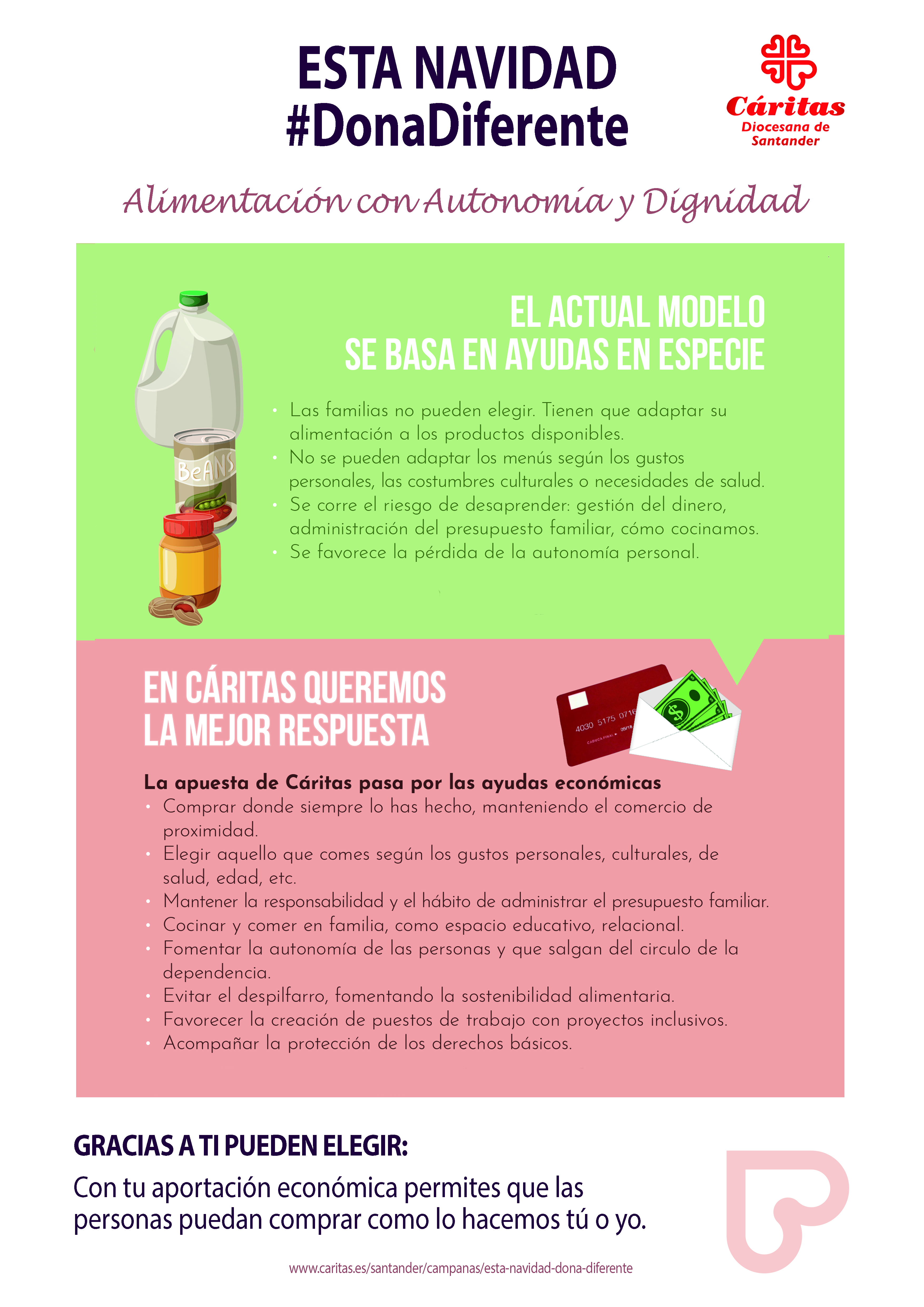 La organización de acción social de la Iglesia entiende la alimentación como un derecho desde la perspectiva de la dignidad y la autonomía de las personas. Por ello, considera que este derecho fundamental no se cubre plenamente si a la recepción de alimentos se le elimina la capacidad de elección de los mismos -según necesidades sanitarias, gusto o tradición cultural-, la responsabilidad de gestionar los recursos económicos para adquirirlos y la libertad de decidir dónde y a quién comprarlos.