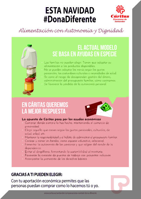 La campaña "Esta Navidad #DonaDiferente" de Cáritas Santander promueve una forma de solidaridad que permita la cobertura de necesidades básicas como la alimentación con autonomía y dignidad.
