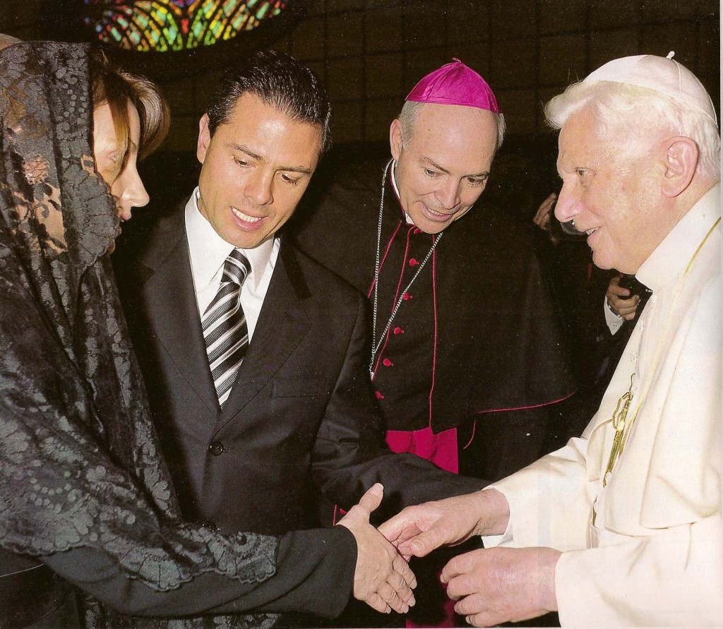 Desde hace rato que Peña Nieto coquetea con la Iglesia. Por eso nombró a Roberto Herrera como su coordinador de Asuntos Religiosos, un puesto que no es muy común en los gobiernos estatales. Una muestra de su interés por mantener buenas relaciones tuvo lugar el 29 de junio de 2010 cuando en la Basílica de San Pedro del Vaticano recibieron la indumentaria litúrgica del Palio dos nuevos arzobispos mexicanos: el mencionado Garfias Merlos y Constancio Miranda Weckmann, arzobispo de Chihuahua.