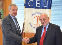 Romano Prodi, el cardenal Re e Ignacio Sánchez Cámara hablan