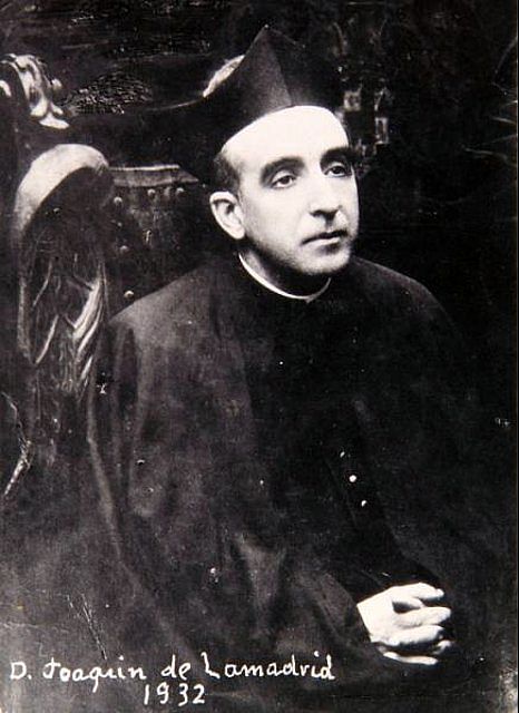 Joaquín de la Madrid Arespacochaga, de 75 años, era conocido como el “padre de los huérfanos”, por el colegio que fundó para ellos. Uno de los que allí vivieron aportó los siguientes datos, publicados por Jorge L. Teulón. Ingresó tardíamente -con 19 años- en el seminario de Murcia, y allí fundó ya en 1880 un asilo para niñas tras una grave inundación. Por traslado de su familia, marcha a Toledo, donde es ordenado sacerdote en 1886. Allí funda un colegio para huérfanos, llamado de la Inmaculada Concepción, en un cigarral al otro lado del Tajo, pasando por el Puente de San Martín. Más tarde, lo trasladó a la calle San Miguel, 9. Por sus dotes de predicación, a pesar de no contar con doctorados, en 1911 fue nombrado Capellán de Reyes en la Catedral y posteriormente Chantre. Los colegiales resaltan su amor a la Virgen, a la Eucaristía y a sus huérfanos, hasta el punto de que se decía: “a don Joaquín puede usted pisotearle, escarnecerle, pero si toca a uno de sus huérfanos, se pondrá como un león”. Solía decir a quienes los atacaran: “¿Solo porque no tengan padres que les defiendan? Pues me tienen a mí que soy su padre”.