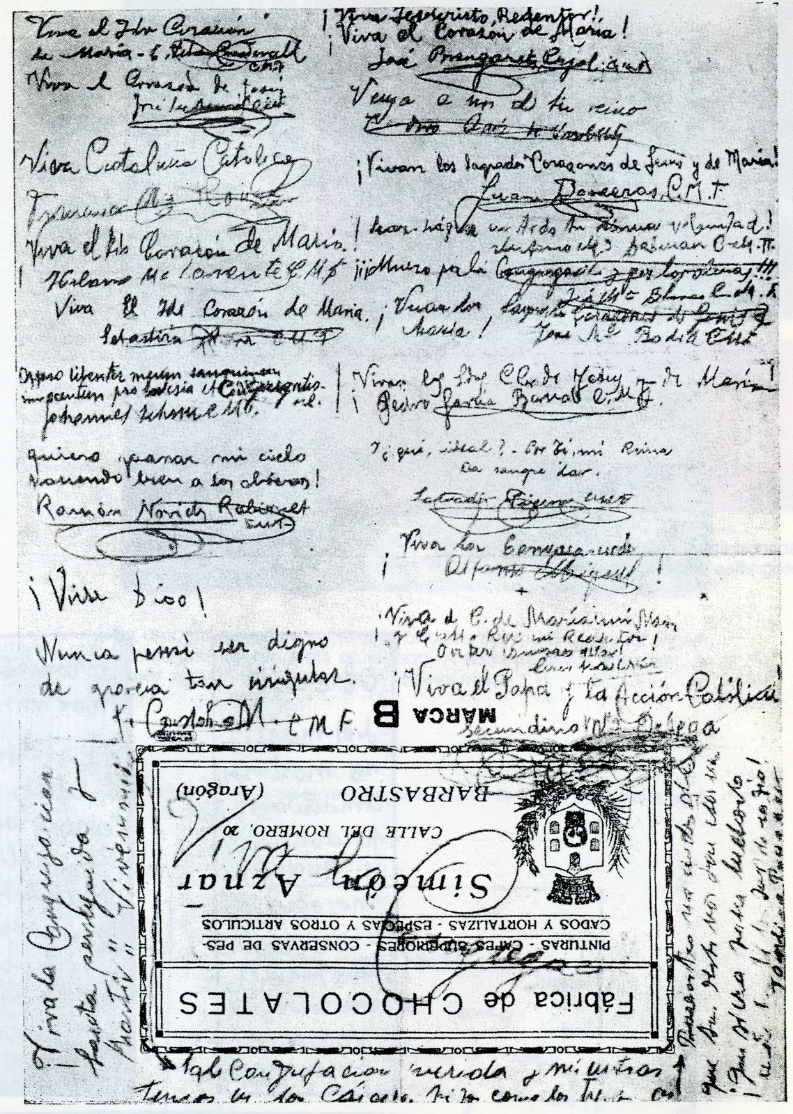 Los nombres y edades de los fallecidos, junto con el deseo que expresaron en el mensaje de despedida, son: Josep María Ros Florensa -escribió: “Viva el obrerismo católico”-, de 21 años; Agustín Viela Ezcurdia -“Domine, dimitte illis” (Señor, perdónalos)-, de 22 años como los tres siguientes; Ramón Illa Salvía -“Gracias y gloria a Dios por todas las cosas”-, Juan Baixeras Berenguer -“¡Vivan los Sagrados Corazones de Jesús y de María!”-, Sebastián Riera Coromina -“Viva el Inmaculado Corazón de María”-; Miguel Masip González -“Por Dios luchar hasta morir.”-, de 23 años como los siete siguientes; José María Amorós Hernández -“Viva el Corazón de Jesús”-, Francisco María Roura Farró -“Viva Cataluña Católica”-, Manuel Martínez Jarauta – hermano coadjutor, sastre en el colegio de Barbastro, escribió: “¡Viva la religión católica!”-, Alfonso Sorribes Teixidó -“Viva el beato padre Claret”-, Rafael Briega Morales -“¡Viva el Corazón de María!”-, José María Badía Mateu -“¡Visca el Cor de Jesús i de María!”-, Luis Escalé Binefa -“Viva los mártires”-; Luis Masferrer Vila -“¡Viva el Corazón de María mi Madre, y Cristo Rey mi Redentor!”-, de 24 años como los tres siguientes, Luis Lladó Teixidó -“Viva el Beato Padre Claret, apóstol y obrero”-, Eduardo Ripoll Diego -“Vivan Cristo rey y el Corazón de María”-, José María Blasco Juan -“¡¡¡Muero por la Congregación y por las almas!!!”-; José Figuero Beltrán -“Perdono a mis enemigos”-, de 25 años como los últimos dos, Faustino Pérez García (autor del texto principal) y Francisco Castán Meseguer hermano coadjutor y portero del colegio de Barbastro, que escribió: “¡Viva Dios! Nunca pensé ser digno de gracia tan grande”. El papel de la imagen incluye mensajes también de algunos de los fusilados el día 13 (ver artículo del 30 de marzo), como Ramón Novich ("Quiero pasar mi cielo haciendo bien a los obreros").