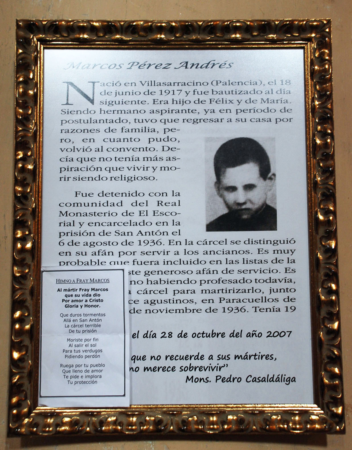 Marcos Pérez Andrés, de 19 años y natural de Villasarracino (Palencia), era aspirante agustino en El Escorial, fue asesinado en Paracuellos de Jarama el 28 de noviembre de 1936 y beatificado en 2007. Por su corta edad y haber muerto en el día con más mártires beatificados de la guerra, podría pasar desapercibido, pero la imagen que aporto constata la devoción existente (probablemente en su pueblo, donde, como se ve, le han hecho un himno), y el detalle biográfico de que “tuvo que regresar a su casa por razones de familia, pero, en cuanto pudo, volvió al convento. Decía que no tenía más aspiración que vivir y morir siendo religioso“.
