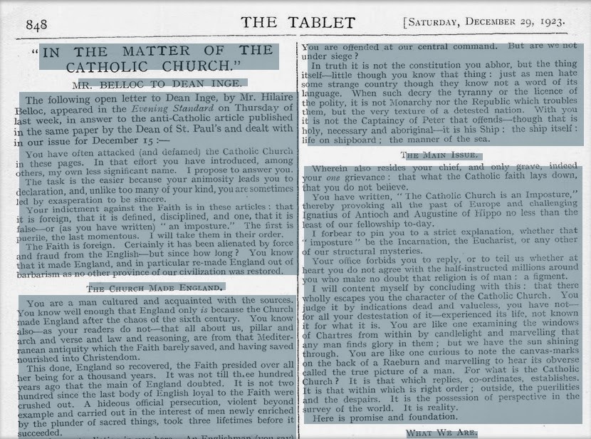 En diciembre de 1923, fue publicada en el “Evening Standard” de Londres una carta abierta de Hilaire Belloc dirigida a un clérigo de la iglesia anglicana, el deán William Inge. Previamente, Inge había publicado varios artículos en los que atacaba a la Iglesia Católica. Después de responder a todas las objeciones del deán, Belloc concluye su carta de la siguiente manera: