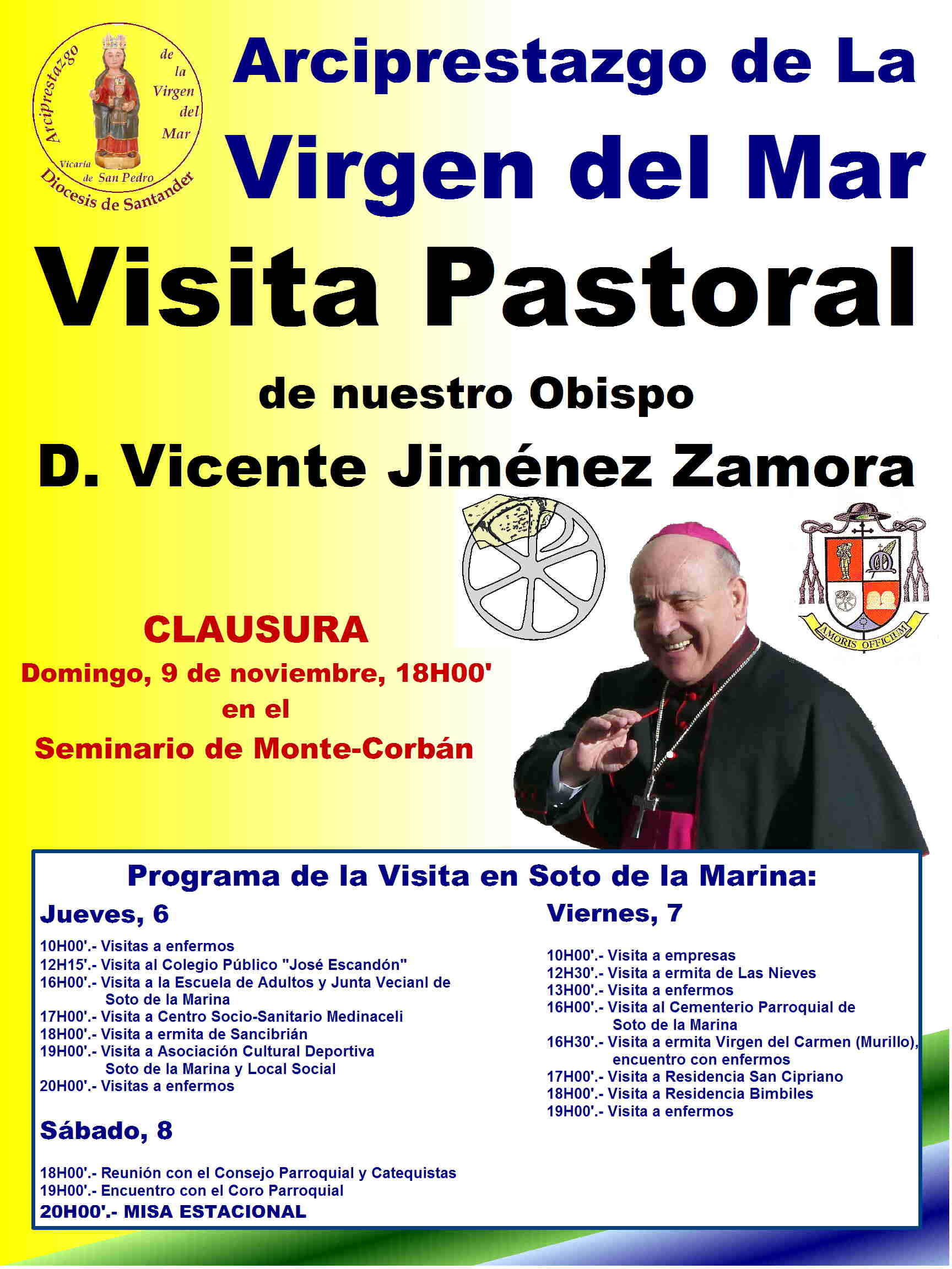 El obispo de Santander, Mons. Vicente Jiménez Zamora, recorrerá entre este jueves 6 y el sábado 8 de noviembre, la parroquia de Soto de la Marina como parte de la gira que está realizando con motivo de la Visita Pastoral que inició el pasado 11 de octubre por el Arciprestazgo de la Virgen del Mar.
