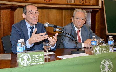 El catedrático emérito de la Universidad de Alcalá de Henares y el El Dr. Leopoldo Gonzalo, Catedrático de Hacienda Pública y Sistema Fiscal de la UNED, participan en el curso de verano sobe el sector servicios de la Universidad Católica de Valencia