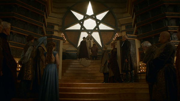 En los Siete Reinos de Juego de tronos la religión dominante es la Fe de los Siete (aunque existen muchas otras como la de los Antiguos Dioses). La Fe venera a los Siete, una única deidad con siete aspectos o rostros (la Madre, el Padre, el Herrero, la Doncella, el Guerrero, la Vieja y el Desconocido) que representan una virtud diferente. Estas siete caras del mismo dios son la particular santísima trinidad de George R. R. Martin, quien confesó haberse basado en el catolicismo para crear la Fe.
