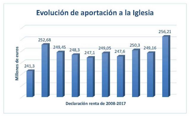 En la declaración de 2017 la cantidad destinada por los contribuyentes a la Iglesia católica aumenta en 7 millones de euros y alcanza los 256,21 millones de euros, un incremento del 2,83% con respecto al año anterior. Es la cifra más alta desde el comienzo del actual sistema de asignación tributaria en 2007, que promedia una subida anual del 0,58%.