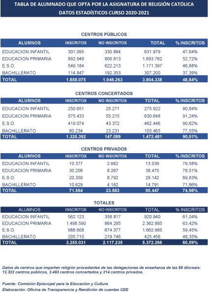 En cuanto a la elección de la enseñanza de Religión Católica al inicio de este complicado curso escolar, desde Educación Infantil hasta Bachillerato, suman 3.255.031 alumnos en España, en todo tipo de centros, lo que significa el 60,59% del alumnado. La comparativa de este porcentaje con el del curso anterior (63%) revela un leve descenso.