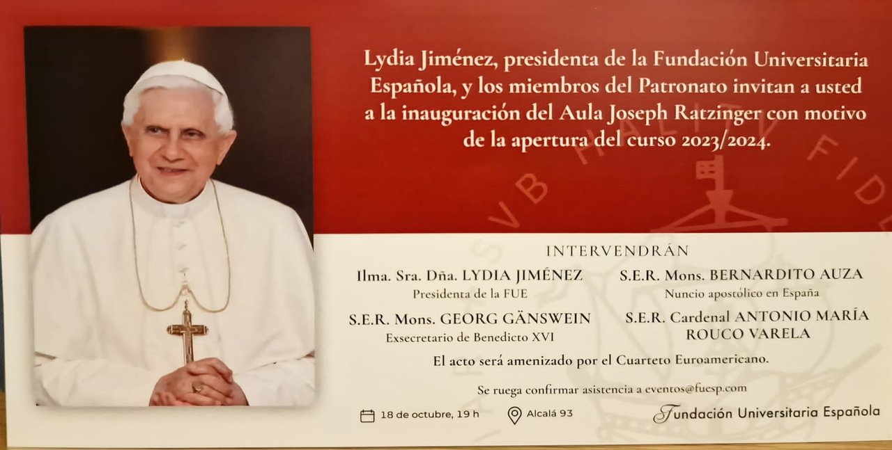 En el acto intervendrán la presidenta de la Fundación, Lydia Jiménez; el Nuncio Apostólico en España, Bernardito Cleopas Auza; el arzobispo emérito de Madrid, cardenal Rouco Varela; y el exsecretario de Benedicto XVI, el arzobispo Georg Gänswein que será el conferenciante.