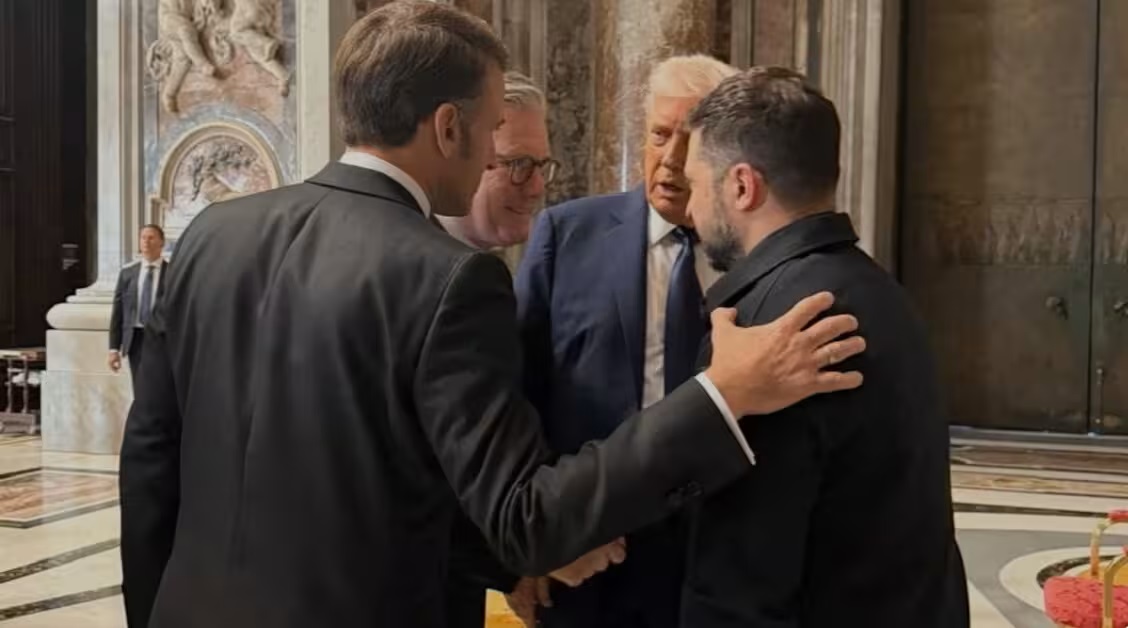 Discretamente, según lo ya establecido previamente, representantes del protocolo vaticano invitaron a penetrar en el interior de la Basílica al presidente francés Emmanuel Macron y al primer ministro del Reino Unido Keir Starmer para que acompañaran a Trump y Zelenski.