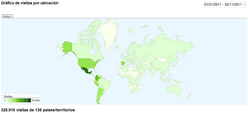 Así, de 120.675 visitas en ese lapso en el 2009, subimos a 149,750, lo cual es un incremento del 24%, llegando a un promedio de poco más de 13.600 visitas mensuales. Muy modesto comparado con otros blogs, pero un indicativo de que nuestro material están llegando de forma efectiva a personas en todas partes del mundo (aunque mayoritariamente a España).