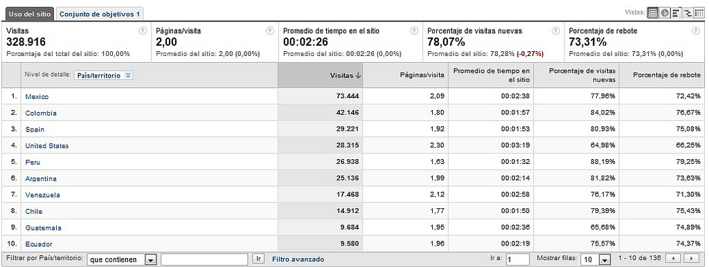 Geográficamente estamos logrando un buen alcance recibiendo visitas desde 136 países, principalmente en México, Colombia, España, Estados Unidos, Perú, Argentina, Venezuela, Chile, Guatemala y Ecuador.