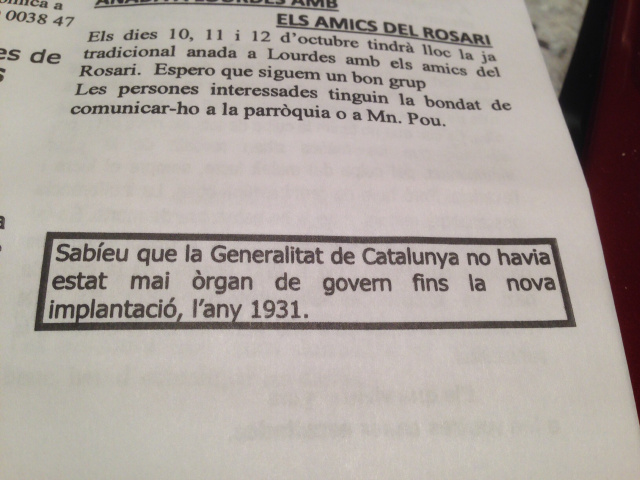 Bien… hasta llegar al final de la contraportada. Porque ahí, en un recuadro que me adjunta y que he colocado como ilustración de este post, alguien, se supone que el reverendo o quien sea pero con el beneplácito del reverendo, ha decidido ilustrar a los fieles sobre competencias de la Generalitat. Exactamente dice (y espero haberlo traducido bien): “Sabíais que la Generalitat de Cataluña no había sido nunca órgano de gobierno hasta la nueva implantación, en 1931”.