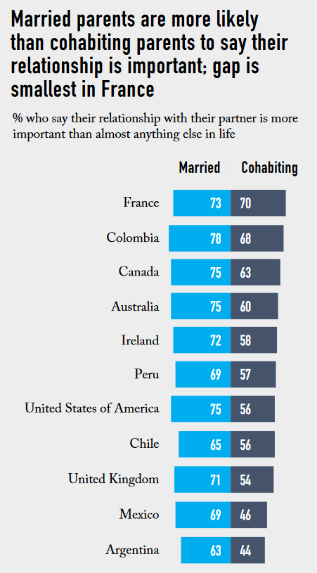 “Una proporción similar de padres casados en Francia (73%) también considera que su relación es una parte esencial de sus vidas”, como se ve en este otro gráfico.