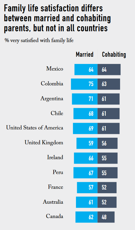Sin embargo, en la parte baja del gráfico se puede ver constatar que “menos de la mitad de los padres que conviven en Canadá (48%) reportaron altos niveles de satisfacción con la vida familiar, y las partes correspondientes también son relativamente bajas en Australia y Francia”, en contraste con las parejas casadas en estos países.