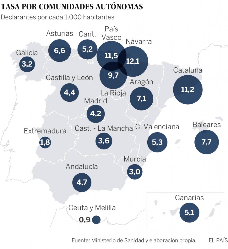 Navarra es la comunidad autónoma que más solicitantes tiene, el 12,1 por cada 1.000 habitantes, le sigue el País Vasco (11,9) y Cataluña (11,2). En la cola, Extremadura (1,8) y Murcia (3)