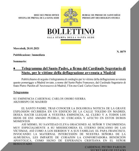 Al conocer la noticia de la explosión, la Secretaría de Estado del Vaticano ha mandado un telegrama en el que el Papa Francisco hace llegar al arzobispo de Madrid, cardenal Carlos Osoro, al clero y a "todos los hijos de ese amado pueblo", "su cercanía y afecto en estos duros momentos".