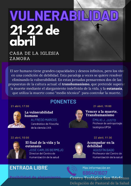 El obispado de Zamora, a través de su Centro Teológico San Ildefonso, ofrece un ciclo de conferencias el 21 y 22 de abril sobre la vulnerabilidad humana en la que se reflexionará desde la perspectiva filosófica, teológica, espiritual y social sobre la debilidad humana y el morir. Es abierto al público y comenzará el viernes a las 17:30 horas en el Seminario-Casa de la Iglesia.