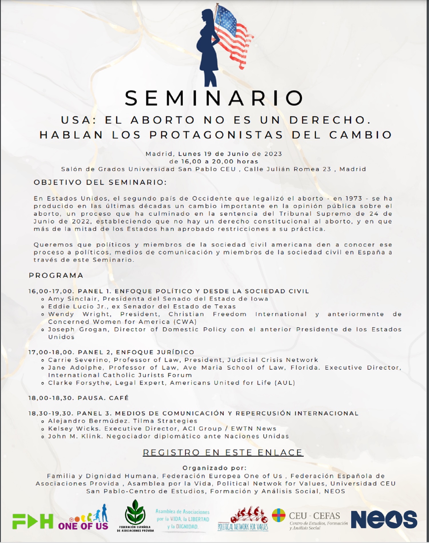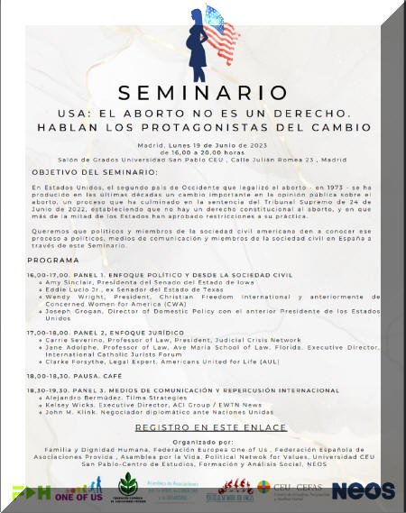 El Seminario ‘USA: El aborto no es un derecho. Hablan los protagonistas del cambio’ tendrá lugar el próximo lunes 19 de junio en el Salón de Grados de la Universidad San Pablo CEU (C/Julian Romea 23, Madrid). Una jornada que se celebrará de 16:00h a 20:00h.